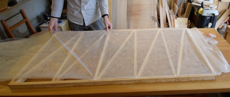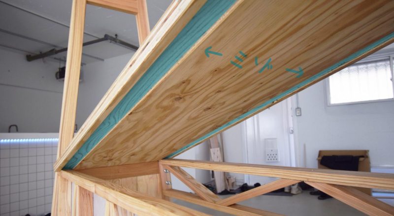 天板は、針葉樹合板にポリ合板という化粧板を張り合わせている。